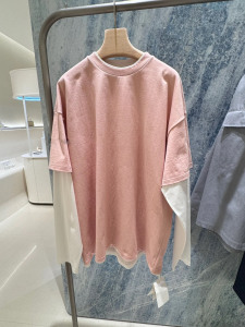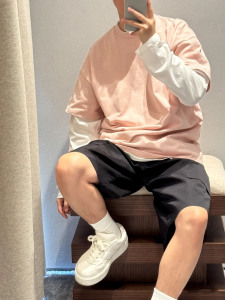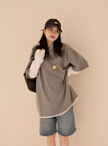 2025早秋新款极简风设计字母印花圆领宽松假两件长袖T恤男女同款