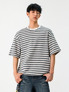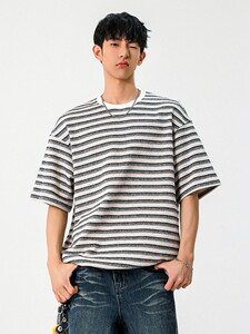 310g重磅肌理撞色条纹短袖T恤男夏季日系复古潮牌宽松半袖体恤衫q