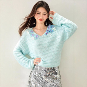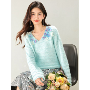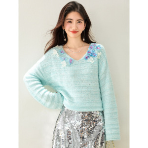 温柔蓝毛衣冬季新款小清新长袖上衣女宽松慵懒小香风女士毛衣6964