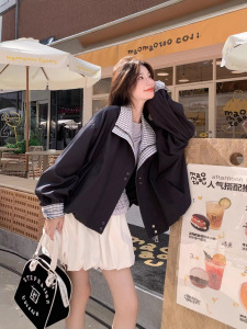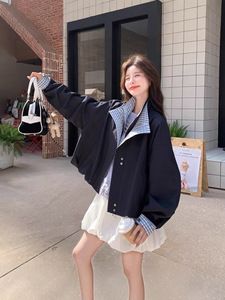 美式跨境复古格纹拼接假两件棒球服外套女春季高级感宽松工装夹克