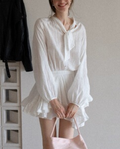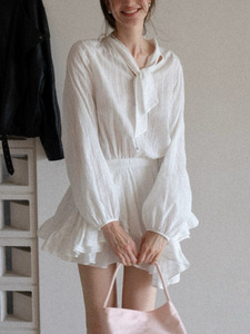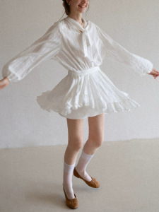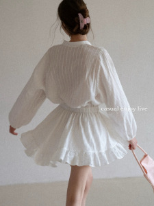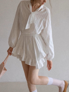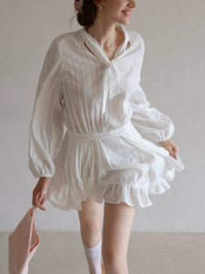 EGGK 肌理感白色长袖连衣裙秋季新法式绑带设计感气质显瘦短裙