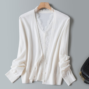 层次感精美蕾丝拼接假两件针织开衫春秋美利奴羊毛长袖薄毛衣010