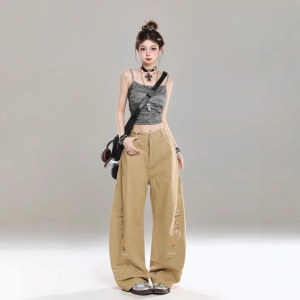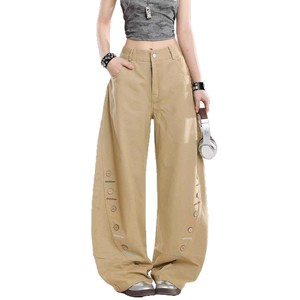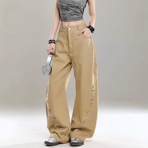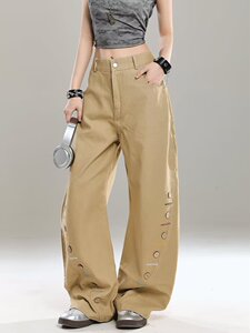 复古美式侧边纽扣装饰弯刀牛仔裤女廓形设计感卡其色休闲香蕉裤子