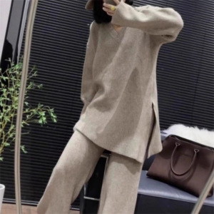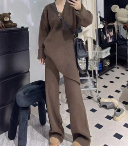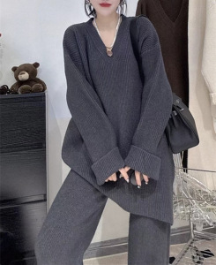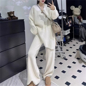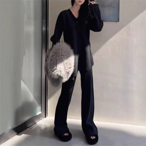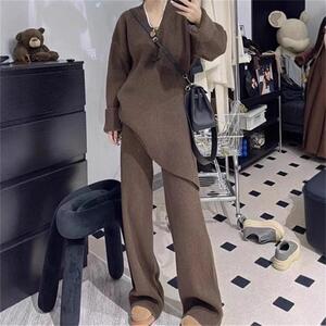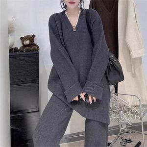 法式慵懒风两件套秋冬外贸高级感宽松显瘦V领毛衣阔腿裤针织套装