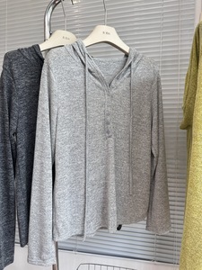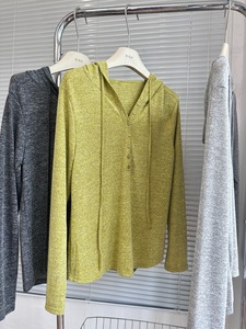 轻盈透气色织肌理棉宽松好穿亲肤舒适连帽亨利领半扣针织长袖女秋