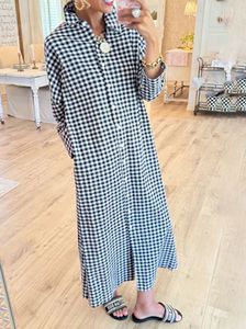 欧美跨境2025时尚女装格子宽松显瘦侧边开叉长款衬衫休闲连衣裙女