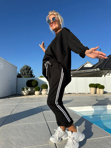 2025秋冬新款欧美跨境独立站女装纯色圆领长袖编带拼接长裤套装女