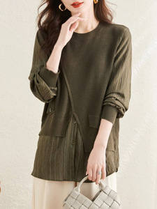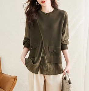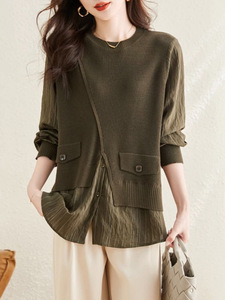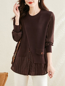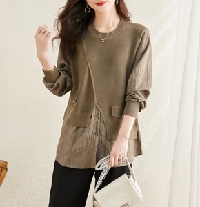 圆领长袖衬衫女春秋新款宽松拼接假两件针织衫洋气设计感小众上衣