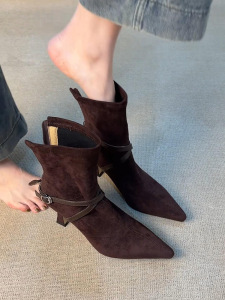 高跟后拉链瘦瘦靴女磨砂皮带扣尖头气质短靴复古细跟单靴