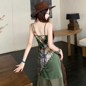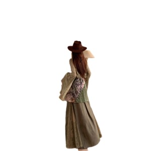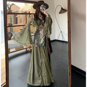 2025秋季绿野仙踪蕾丝拼接吊带+复古拼接拉链半身裙+蕾丝开衫套装