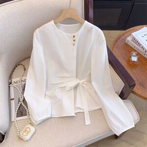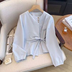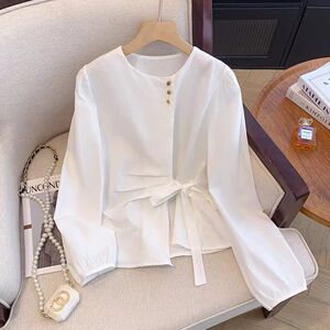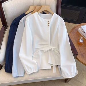 韩系新款气质长袖衬衫女款秋季蝴蝶结绑带别致衬衣不规则设计上衣