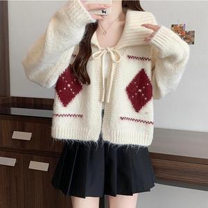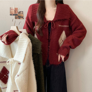 韩系秋冬新款 文艺复古风翻领厚毛衣女外套 宽松减龄针织开衫上衣