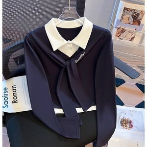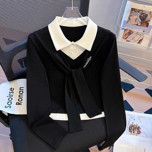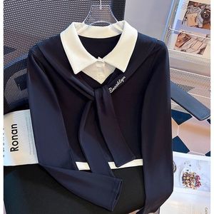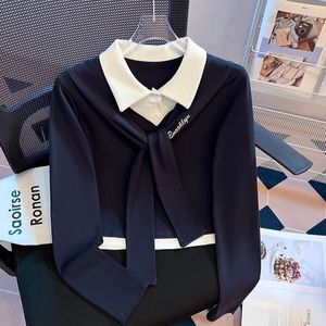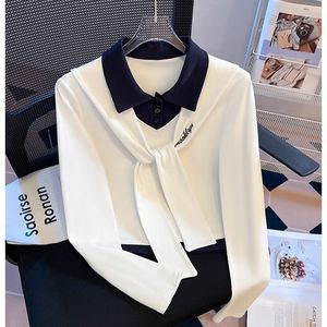 学院风系带撞色翻领假两件长袖t恤女2025春秋新款设计感短款上衣