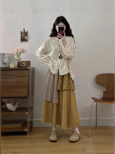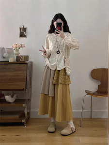 大码胖mm森系娃娃领印花棉布衬衫+拼接高腰半身裙两件套