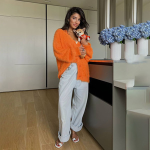 欧美新款豹绒针织开衫毛衣V 领设计显优雅多彩款式个性满满宽松女