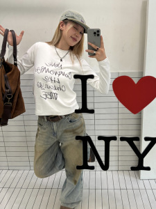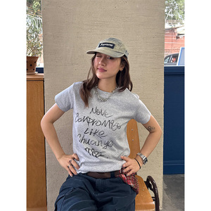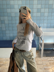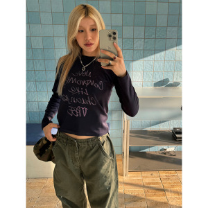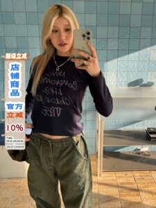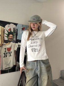 川川也 美式正肩长袖T恤女街头内搭修身打底衫辣妹印花显瘦上衣潮