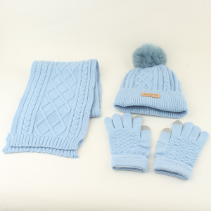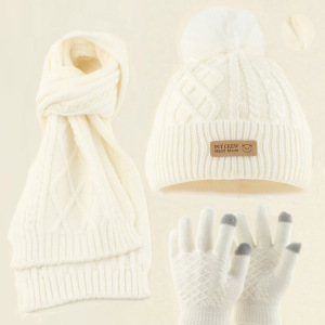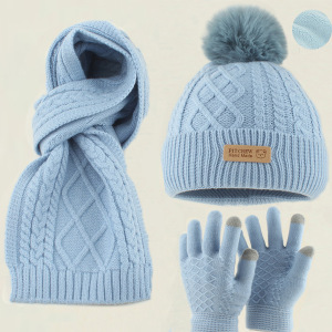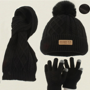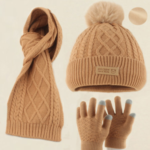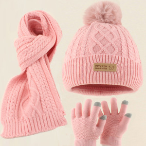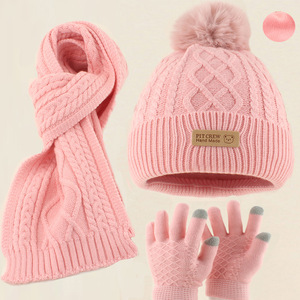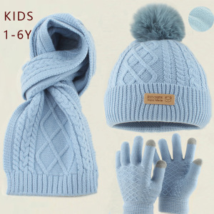 1-6Y新款秋冬中大童围巾帽子手套套装加绒保暖皮标菱格针织三件套