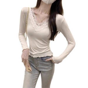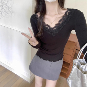 纯欲风蕾丝花边内搭打底衫女秋冬季2025新款上衣白色V领长袖t恤