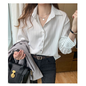 跨境秋季新款小众上衣复古港味白色条纹衬衫设计感轻熟叠穿衬衣女