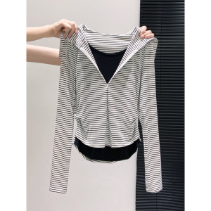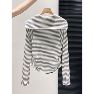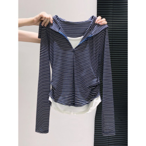 条纹长袖T恤2025早秋新款海军风气质收腰假两件内搭打底衫A6975