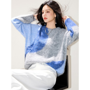 慵懒灰蓝色2025年秋季时尚百搭宽松套头圆领显瘦气质长袖毛衣上衣