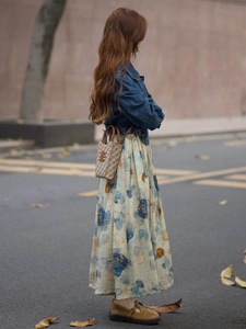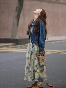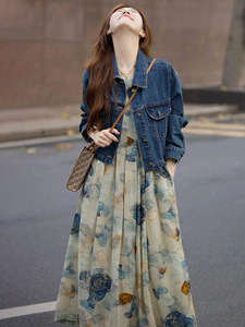 秋装搭配一整套高级感减龄牛仔外套水墨画连衣裙两件套装碎花长裙