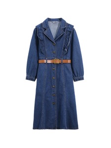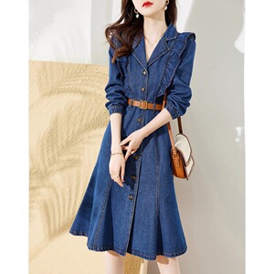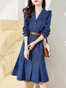 牛仔木耳边连衣裙春秋款2025新款女装气质高端女神范中长裙子显瘦