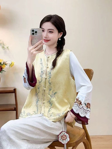 2025秋款挂里国风圆领坎肩民族风女装刺绣宽松女士缎面马甲