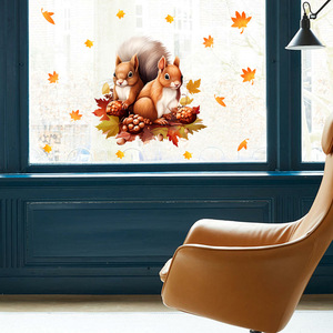 跨境亚马逊松鼠秋天落叶静电玻璃贴适用于卧室玻璃窗户家居装饰贴