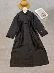 2025秋冬经典花纹新中式真丝香云纱手工复古盘扣下摆开衩长风衣67