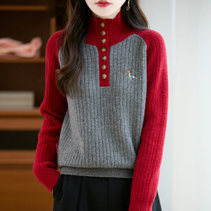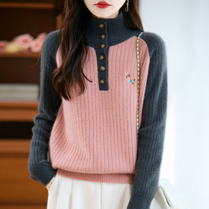 七针加厚半高领女式毛衣100纯羊毛衫内搭秋冬新款拼色刺绣小马衫