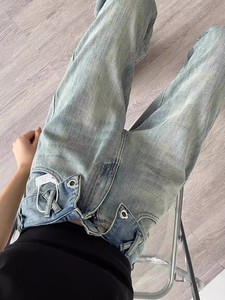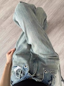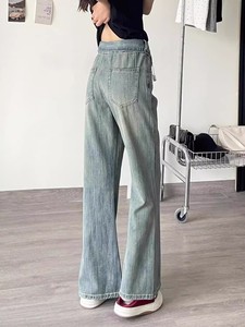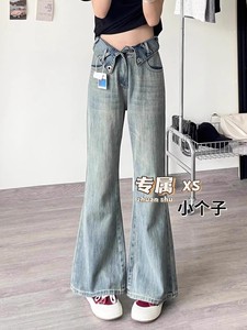 美式翻腰设计感微喇牛仔裤女XS小个子高腰宽松显瘦阔腿直筒拖地裤