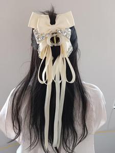 米白色-闪钻蝴蝶结长飘带马尾夹
