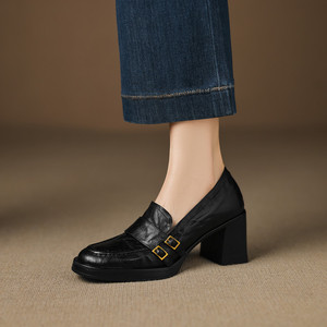 牛皮现货!粗跟增高一脚蹬乐福鞋女皮带扣百搭高跟圆头通勤小皮鞋