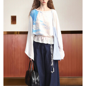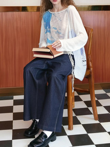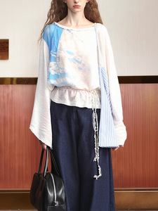 法式休闲两穿一字斜肩T恤2025早秋新款印花防晒衫上衣
