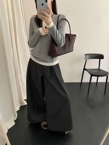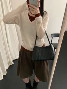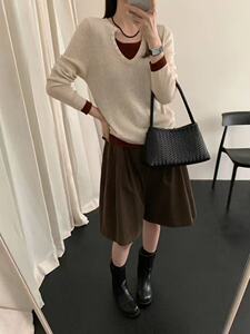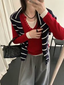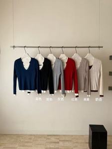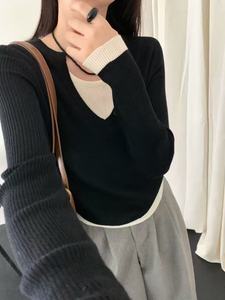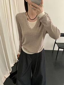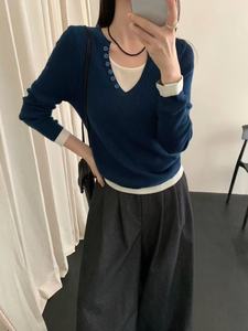 假两件叠穿针织套头衫V领长袖上衣打底秋冬新品纽扣设计感上衣