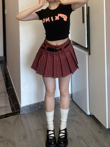 美式复古设计感红色格子百褶裙女大码胖mm学院风半身裙甜辣妹短裙