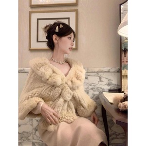 中古千金感翻折花瓣领毛毛斗篷披肩/小香风蕾丝气质连衣裙套装女