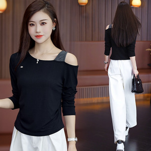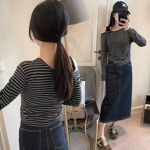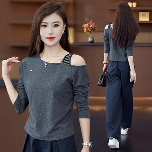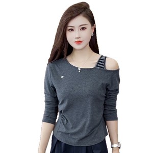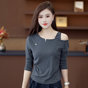 灰色露肩长袖t恤女2025新款早秋修身显瘦上衣时尚洋气女士打底衫