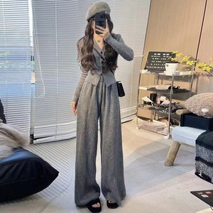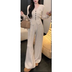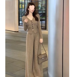 大码女装休闲复古针织套装春季感上衣胖显瘦阔腿裤子两件套