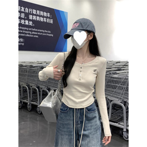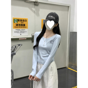浅蓝色miu系温柔卡腰褶皱上衣2025春秋正肩刺绣纽扣T恤长袖打底衫