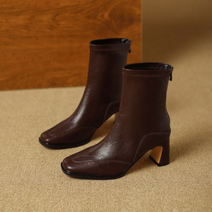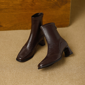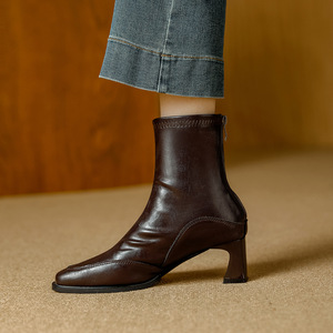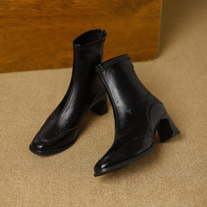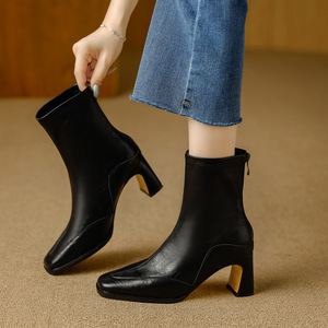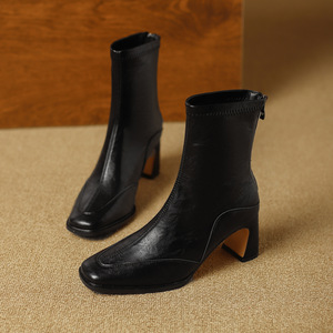 方头短靴女粗跟2025秋冬新款后拉链软皮小众文艺复古风显瘦弹力靴