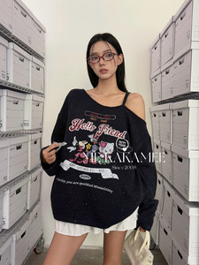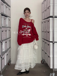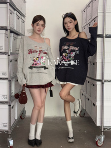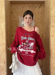 ME KAKAMEE十三行秋美式卡通喷画彩纱大版露肩毛衣(配胸针) S215