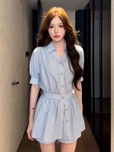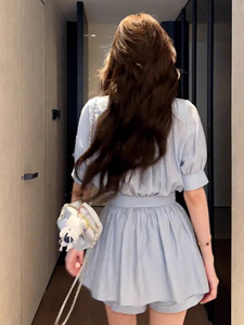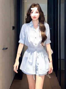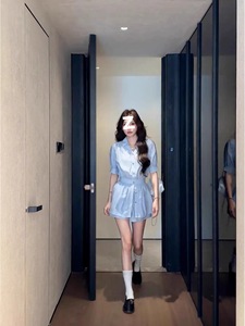 小个子绝美蓝色衬衫连衣裙子女夏季2025新款今年流行短裙套装