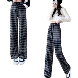 跨境大码毛呢阔腿裤女秋季高腰垂感宽松咖色格子休先裤子拖地直筒