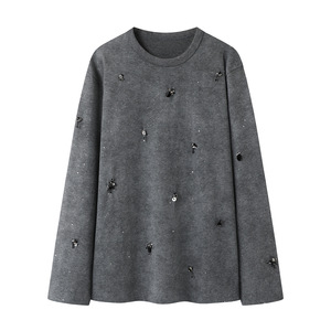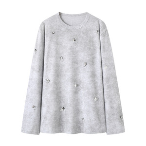 现货2025秋新品简约显瘦手工钉珠刺绣长袖T恤上衣5P9113720