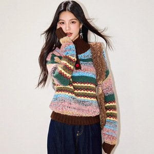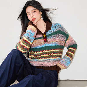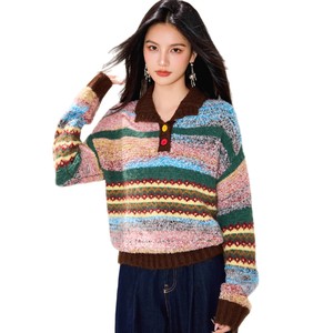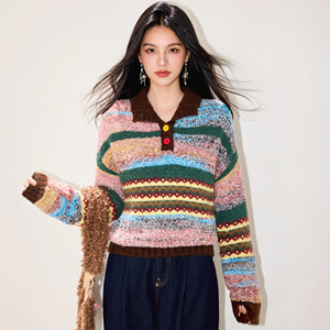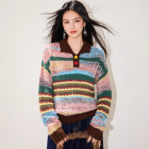 彩色复古polo领套头毛衣女秋冬季加厚设计感小众美拉德撞色针织衫