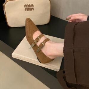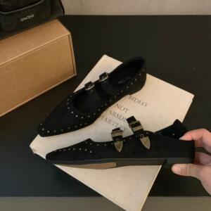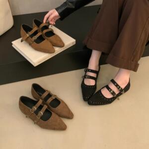 复古平底玛丽珍鞋2025新款尖头铆钉双排皮带扣单鞋女休闲内增高鞋