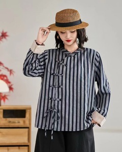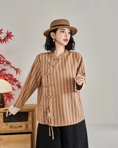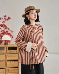 2025秋季新款中式复古老布麻条纹上衣女立领斜襟盘扣色织条纹外套