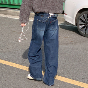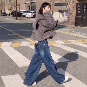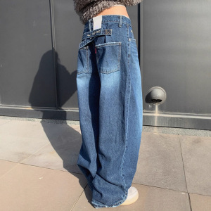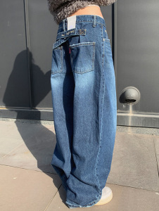 东大门秋装新品韩版高腰复古后系扣设计深青显瘦阔腿牛仔裤女长裤